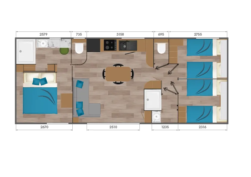 Sie verfügen über drei Schlafzimmer: ein Elternschlafzimmer mit Doppelbett (160×190 cm), ein Schlafzimmer mit zwei Einzelbetten (80×190 cm) sowie ein weiteres Schlafzimmer mit einem Einzelbett.