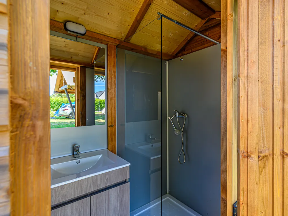 Erleben Sie einen Aufenthalt auf einem nackten Stellplatz, ausgestattet mit unserer Freecamp-Hütte. Genießen Sie eine durchschnittliche Fläche von 100 m², ideal für einen Premium-Aufenthalt im Zelt, Wohnwagen oder Wohnmobil. Mit unserem Freecamp profitieren Sie von zahlreichen Vorteilen: Sie müssen nicht mehr in der Schlange für die Duschen des Sanitärgebäudes stehen, denn Sie verfügen über einen eigenen, überdachten Mini-Sanitärbereich mit Dusche, Waschbecken, separater Toilette und einem Außenspülbecken.
